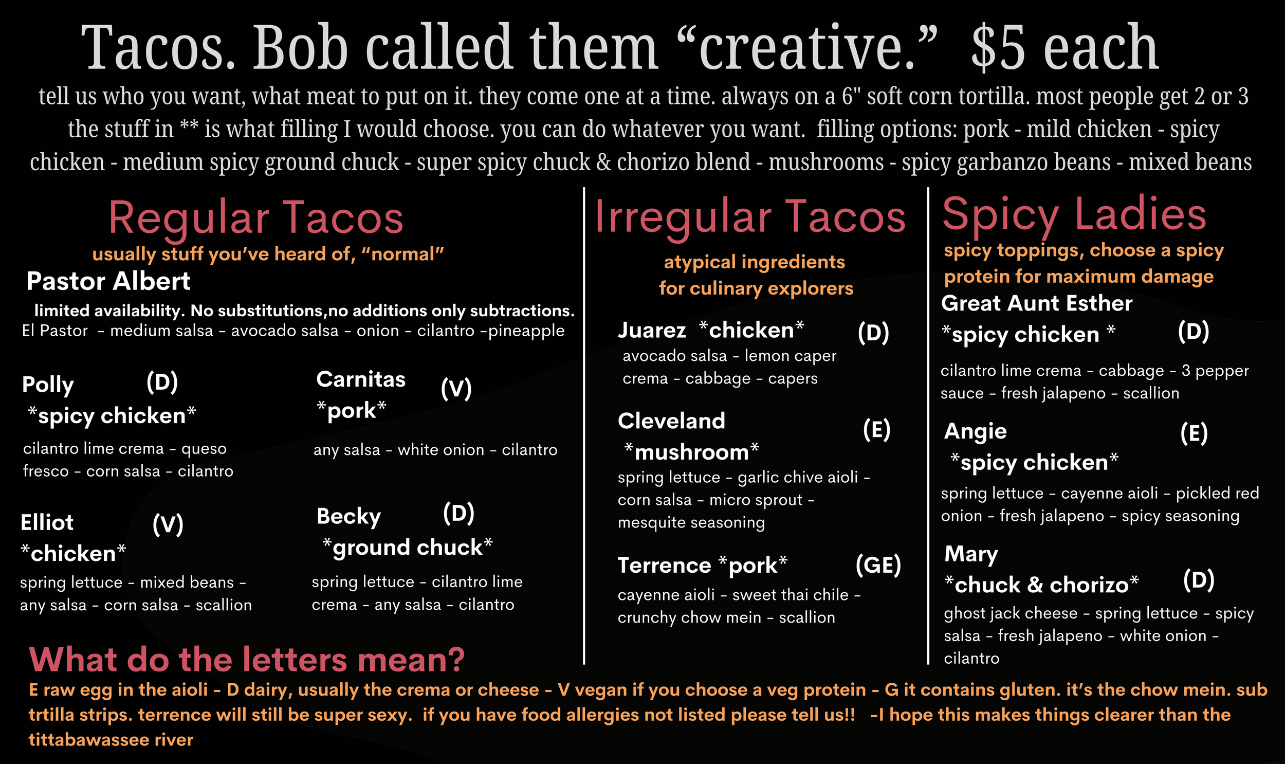 This is what we sell. There are many options, but not more than you can handle. Sometimes we neglect the updating of this menu, we don’t do it intentionally. Ask if you have questions, or stay curious.